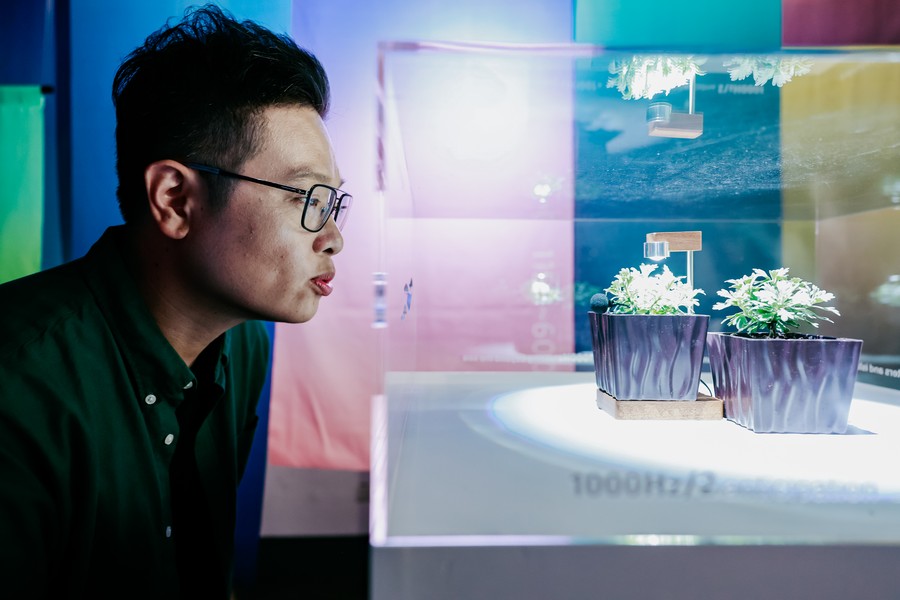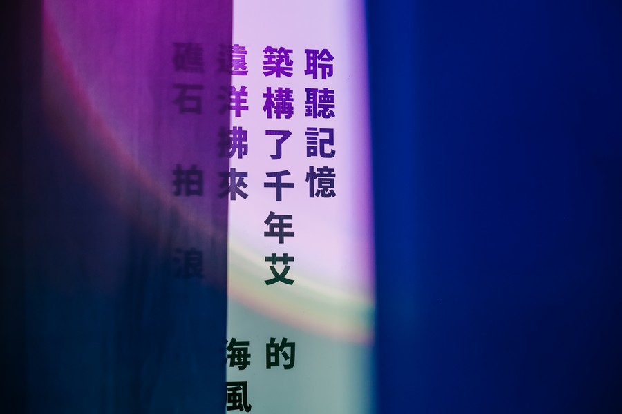 走進小文創教室這座宛如「離島」的展間裡,彷彿被邀請登上蘭嶼、綠島。作品以「千年艾」為核心精神,創作人將島嶼採集的聲景:浪、潮、草叢與鳥鳴,甚至機車呼嘯、回收車與放學鐘聲,以AI(Artificial Intelligence)聲響重新編織。透過觀展的互動,當對著植株輕輕吹氣,感測模組會讀取震動頻率,讓觀者與島上1000Hz的脈搏相遇。