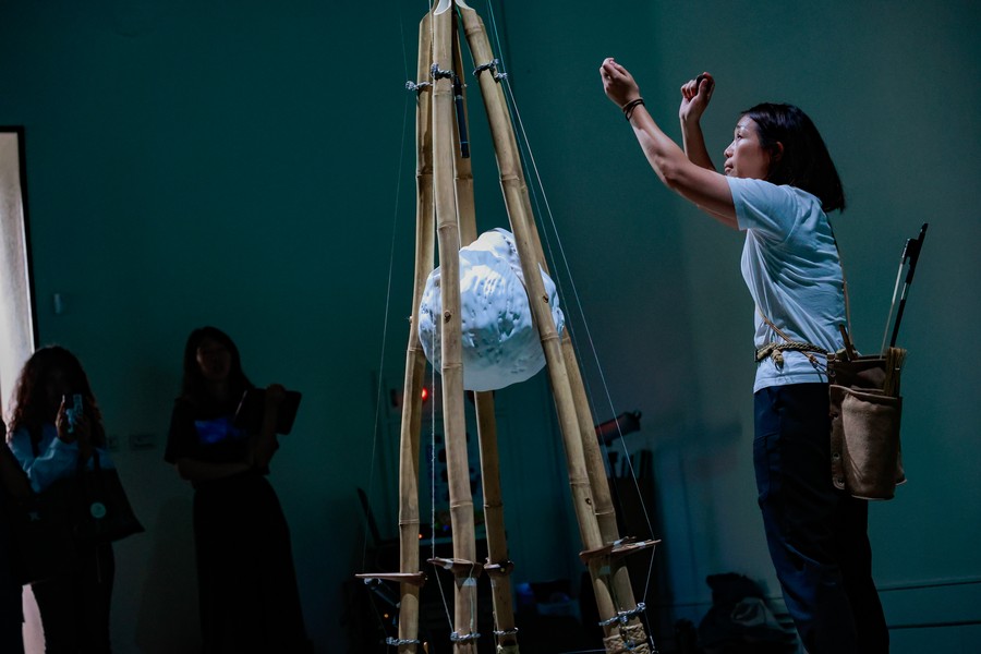再由擊樂家張幼欣接手,傾聽器物的形態與脈動,以敲擊回應它的張力與共鳴。也因作品以天然材質為骨肉,不斷受環境溫溼度改變而產生質變,對擊樂家而言,每一次都面對必要的即時協商,每一場演出都是重新認識彼此的旅程,既挑戰也充滿變化趣味。