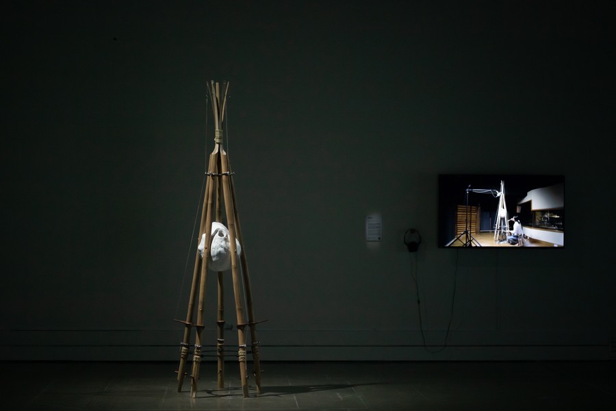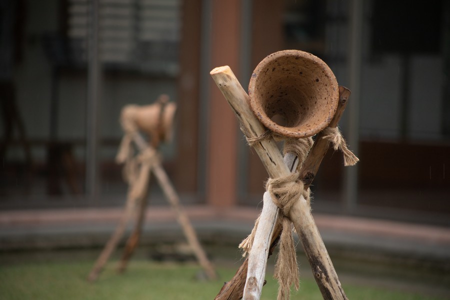 運用那些山裡撿拾與記憶觸發的材料,如竹、藤、苧麻、魚線與石膏,被形塑成一具既是雕塑,也能被「演奏」的樂器,成為呼應在地歷史事件與個人生命經驗的隱喻入口。
