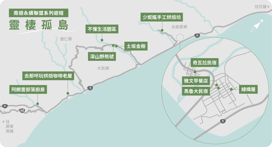 兩日遊程推薦路線|線織屋、奇瓦拉民宿、馬魯大民宿、雅文早餐店、少妮媱手工烘焙坊、不懂生活園區、深山野熊號、土坂金樹民宿、CINEVUAN.去那呼玩、阿朗壹部落廚房